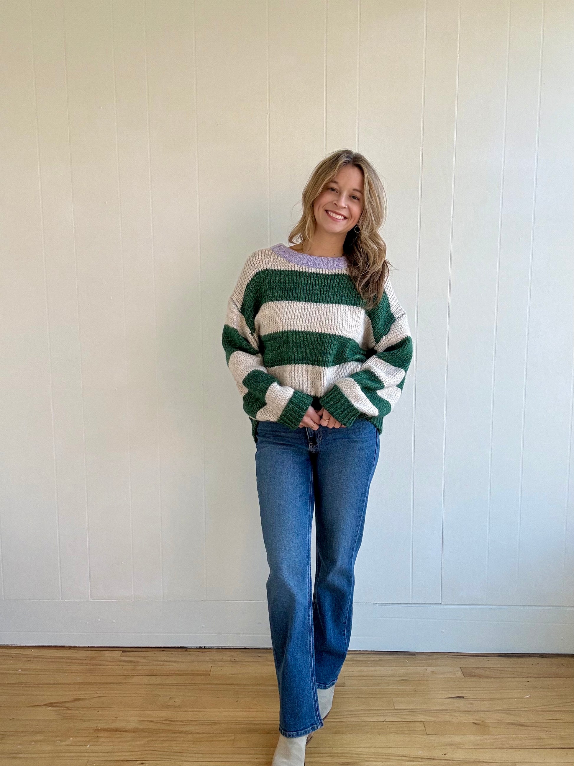 The sweater you’ll live in all season long. This oversized knit features bold forest green stripes and a contrasting lavender neckline for a playful twist. Easy to throw on with jeans or a maxi skirt- cozy, carefree, and totally essential.