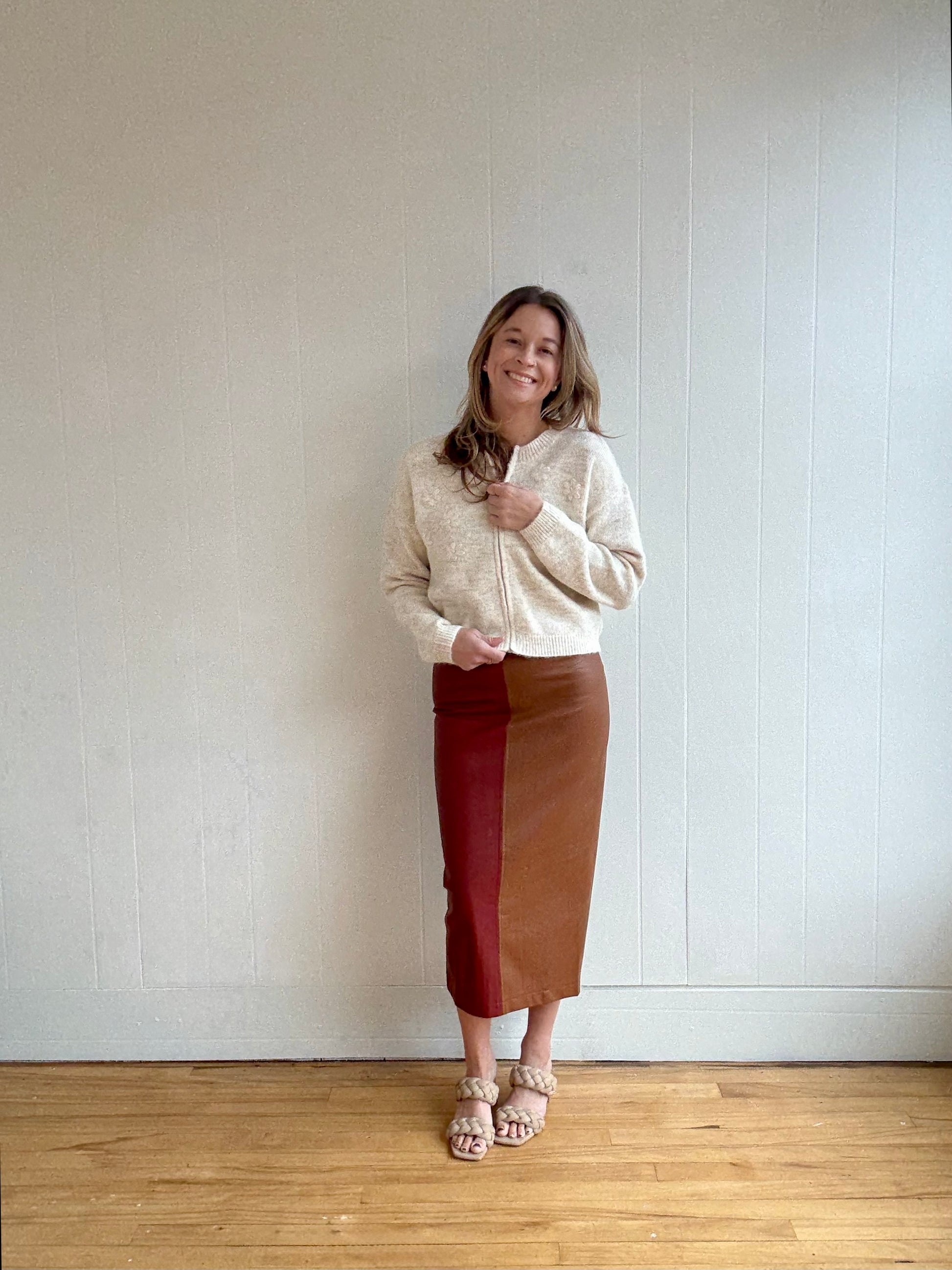 This Alix Dress is a versatile and stylish choice thanks to its vegan polyurethane material and color blocked design. The hidden zipper adds a touch of sophistication while the lined top provides comfort. With adjustable bra straps, this midi dress offers both fashion and function.