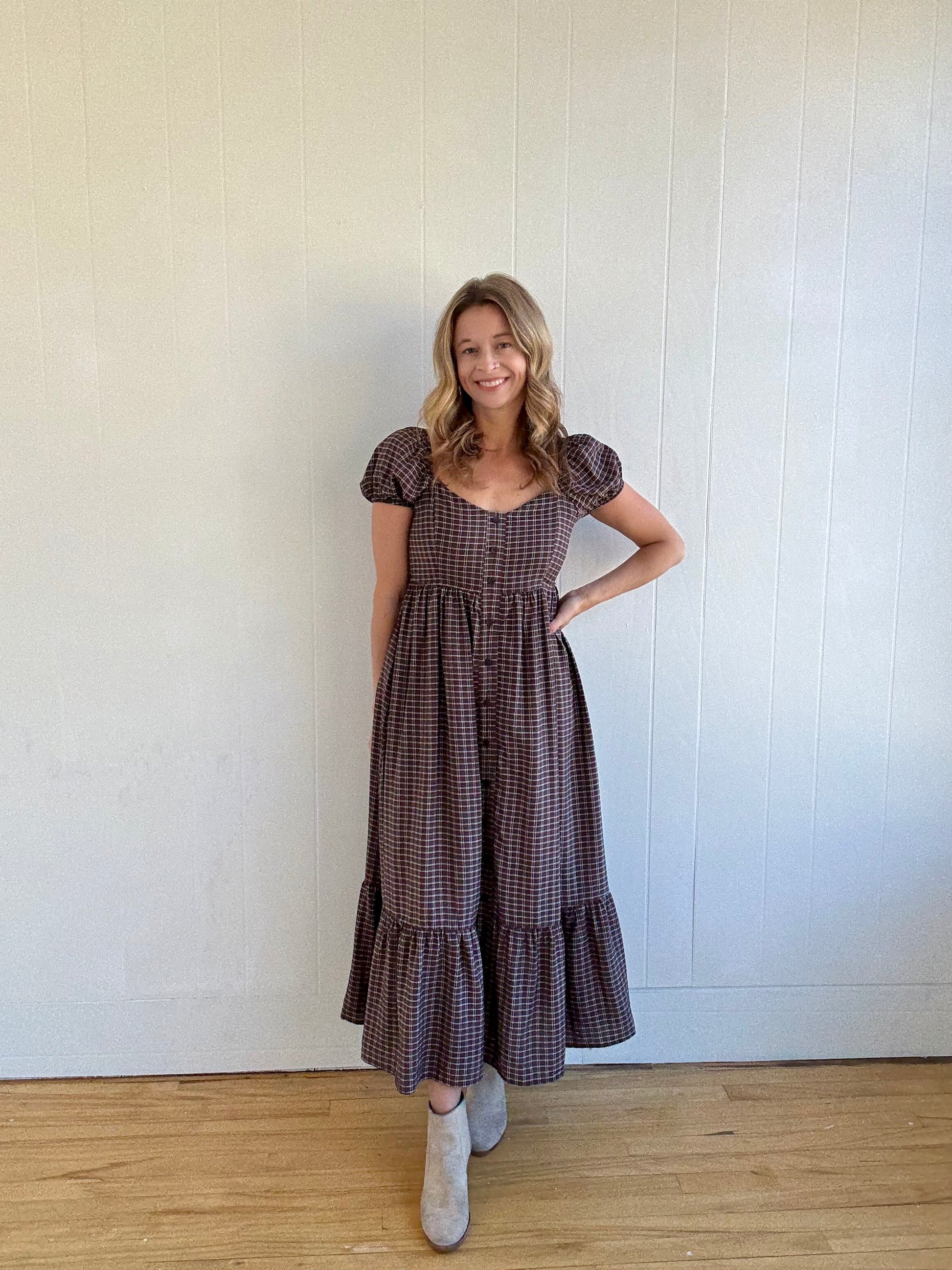 This charming midi dress features a flattering smocked waist and playful puff sleeves, adorned with a classic all-over check pattern. Designed with a tiered skirt and button-down front, it’s a sweet yet timeless option for everyday wear or weekend outings.