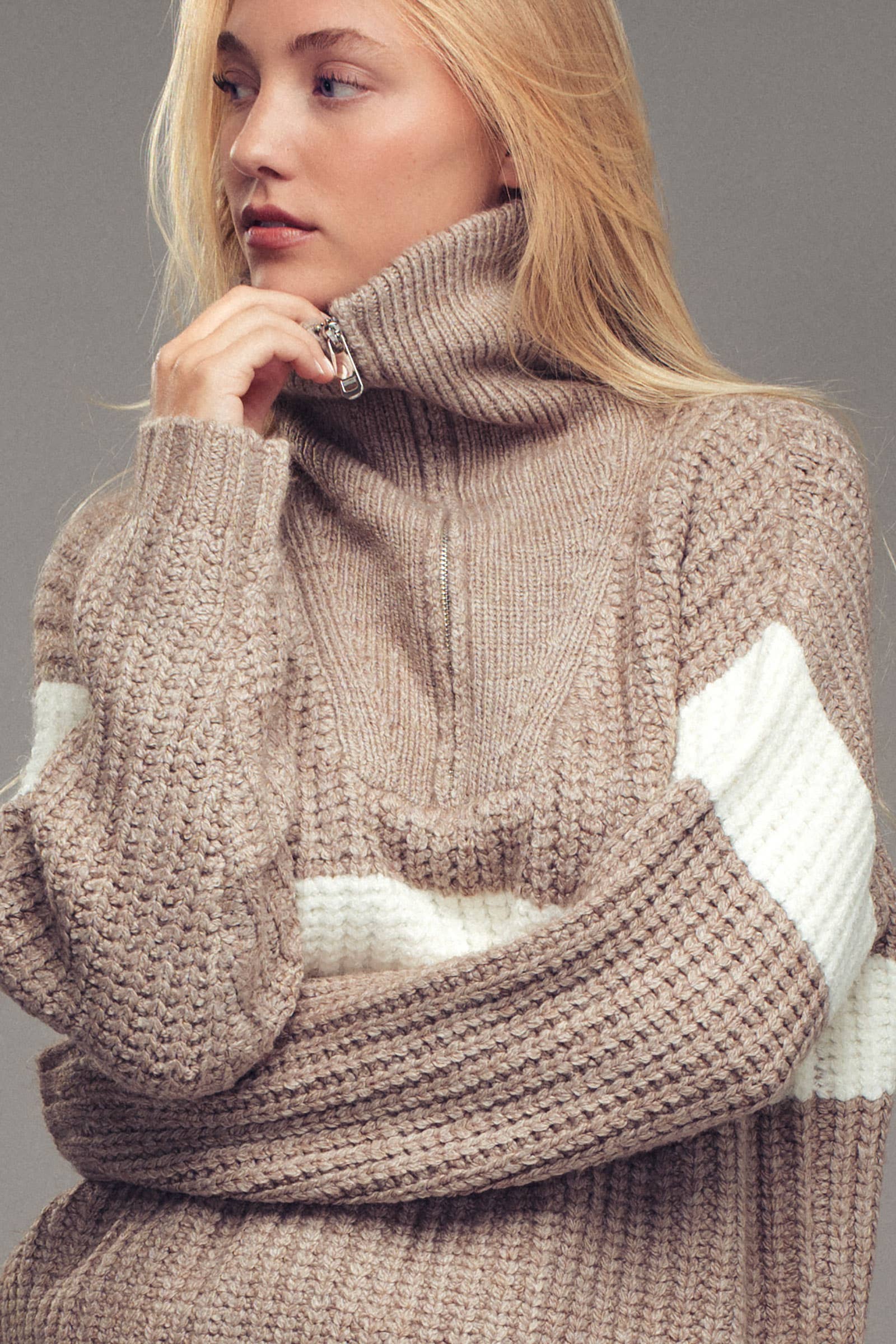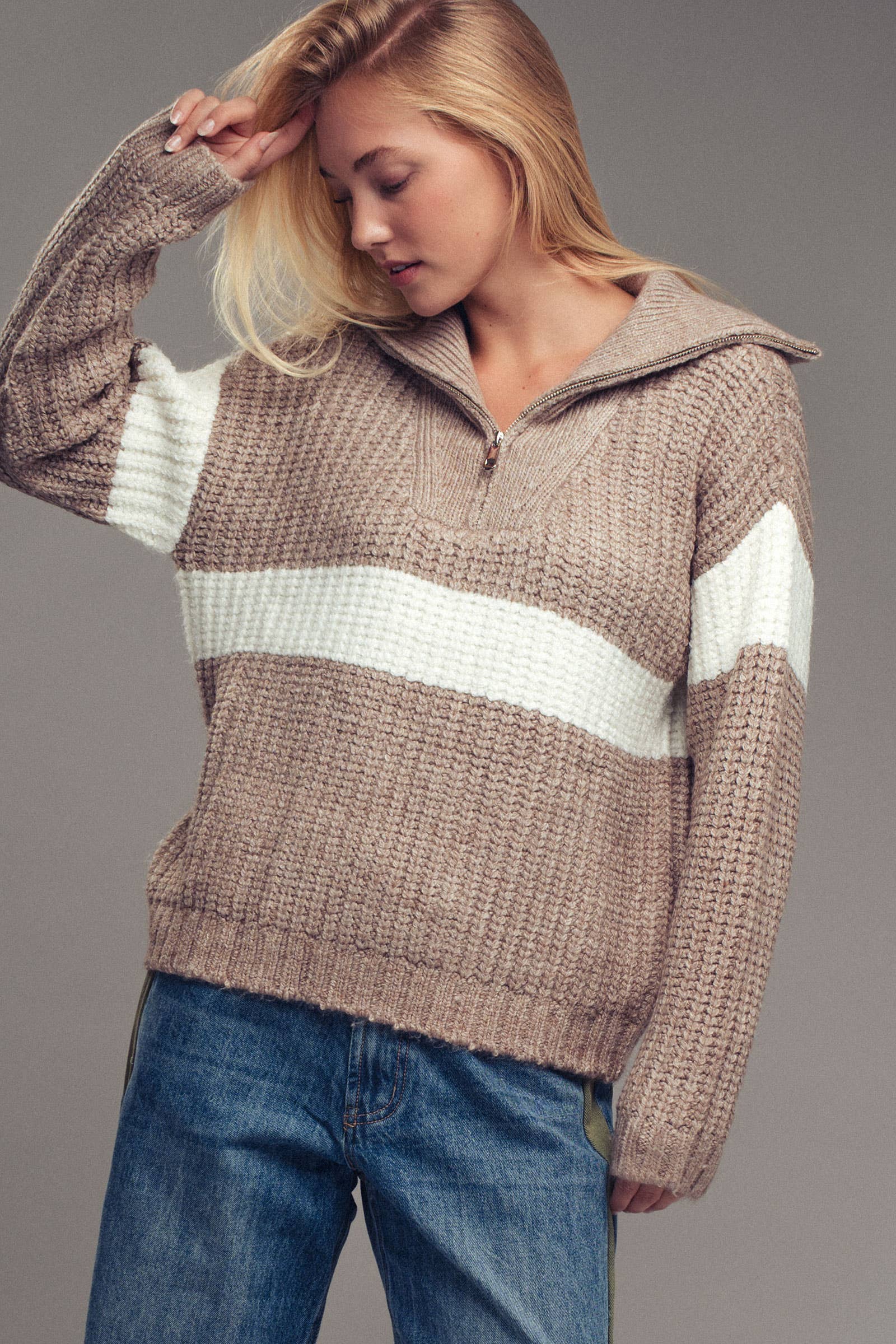 Stay cozy and stylish in this chunky knit sweater featuring a bold contrast stripe and sporty half-zip collar. Designed for comfort and layering, it's the perfect go-to for everyday wear or chilly outings.