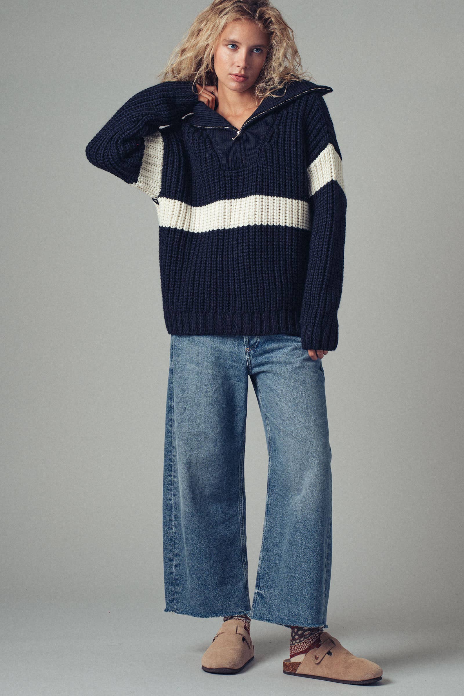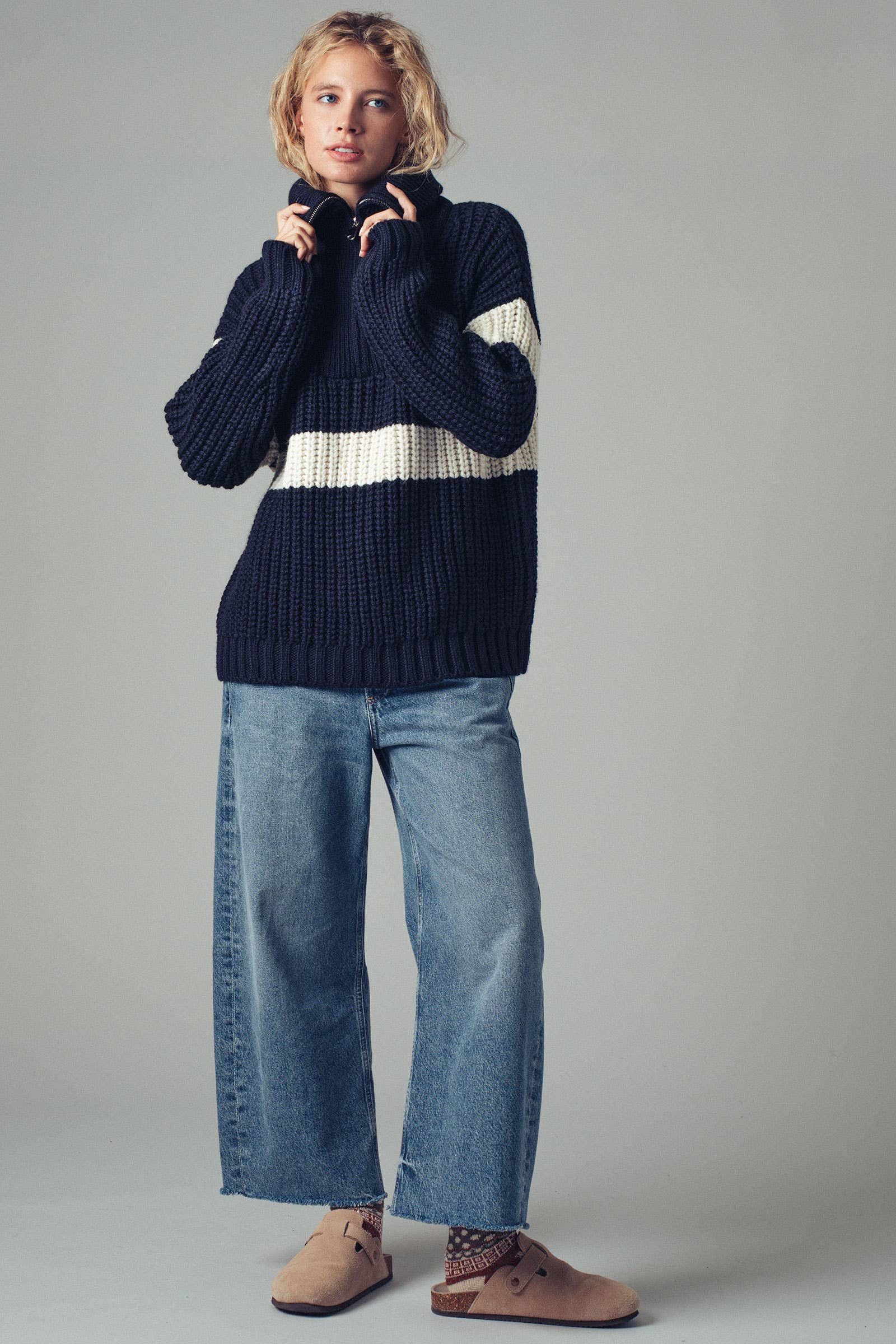 Stay cozy and stylish in this chunky knit sweater featuring a bold contrast stripe and sporty half-zip collar. Designed for comfort and layering, it's the perfect go-to for everyday wear or chilly outings.