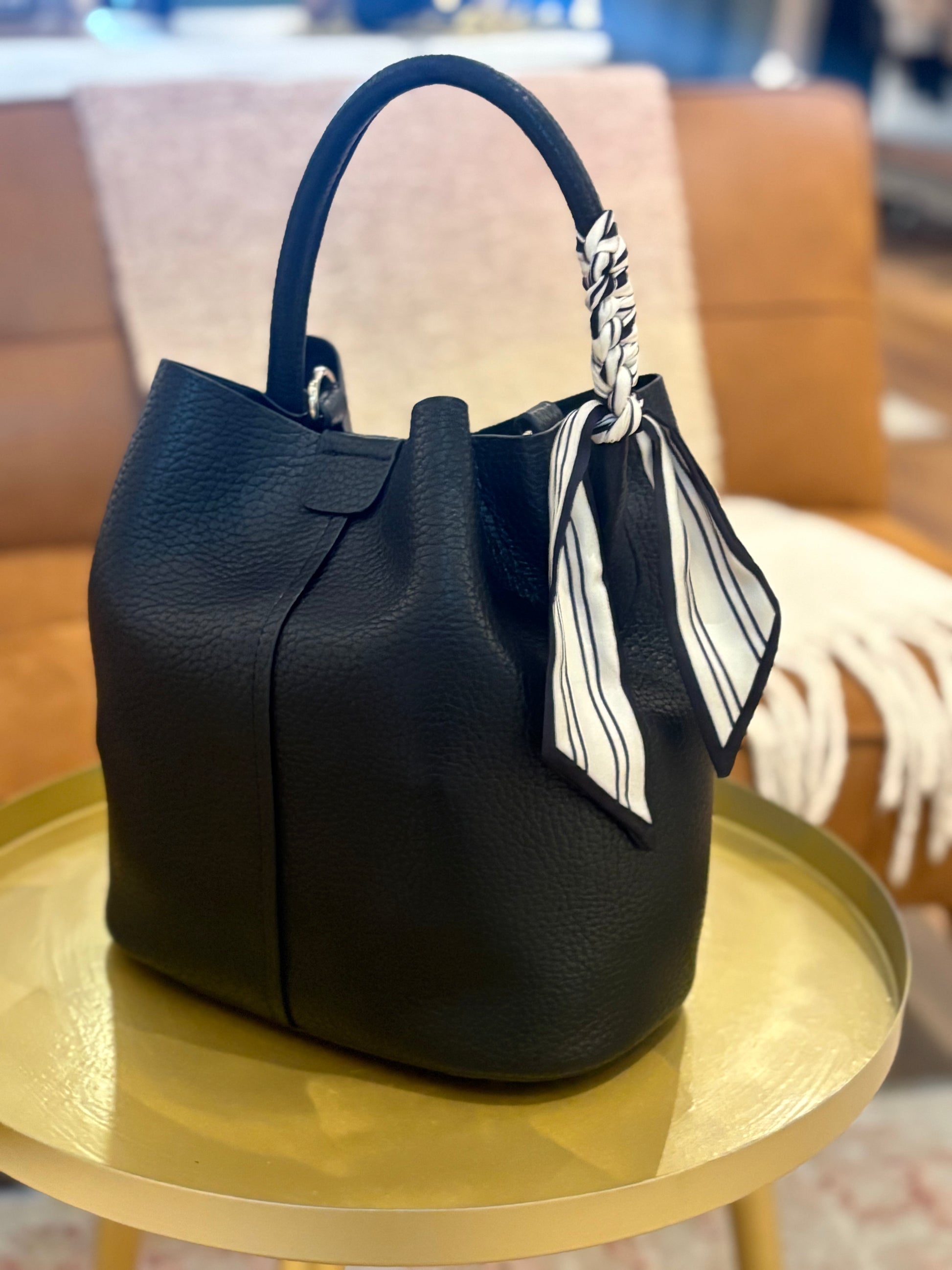 Discover your new go-to accessory before you leave the house! Introducing the Blair Purse, a larger version of our Blair Bucket Bag. Crafted with a durable polyurethane material, this adorable and functional bag features an additional strap for crossbody wear. Every bag has a unique scarf attached to the handle that adds a nice touch. Perfect for every day wear while still elevating your look.