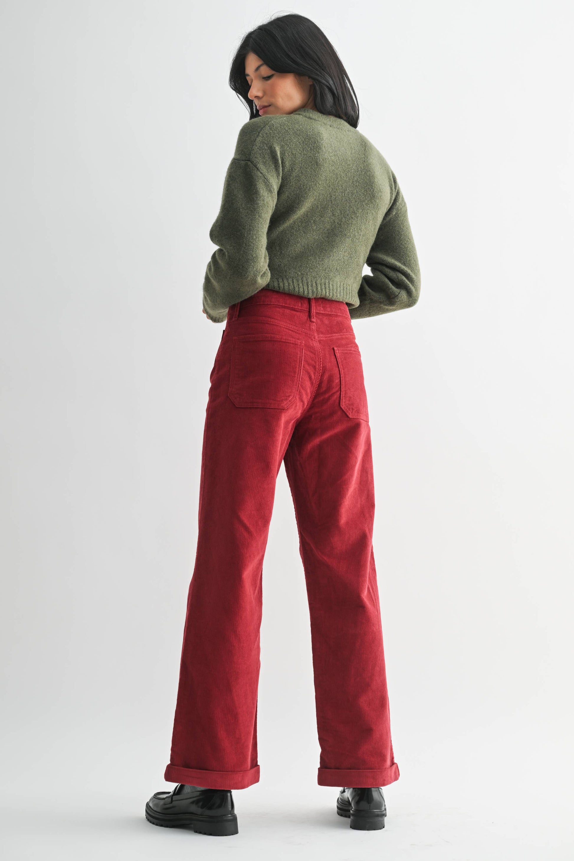 Introducing the Crimson Corduroy Pant. These pants feature mini patch pockets and a longer, wider leg for a comfortable and stylish fit. Perfect for any occasion, these pants are a must-have for any fashion-forward individual.