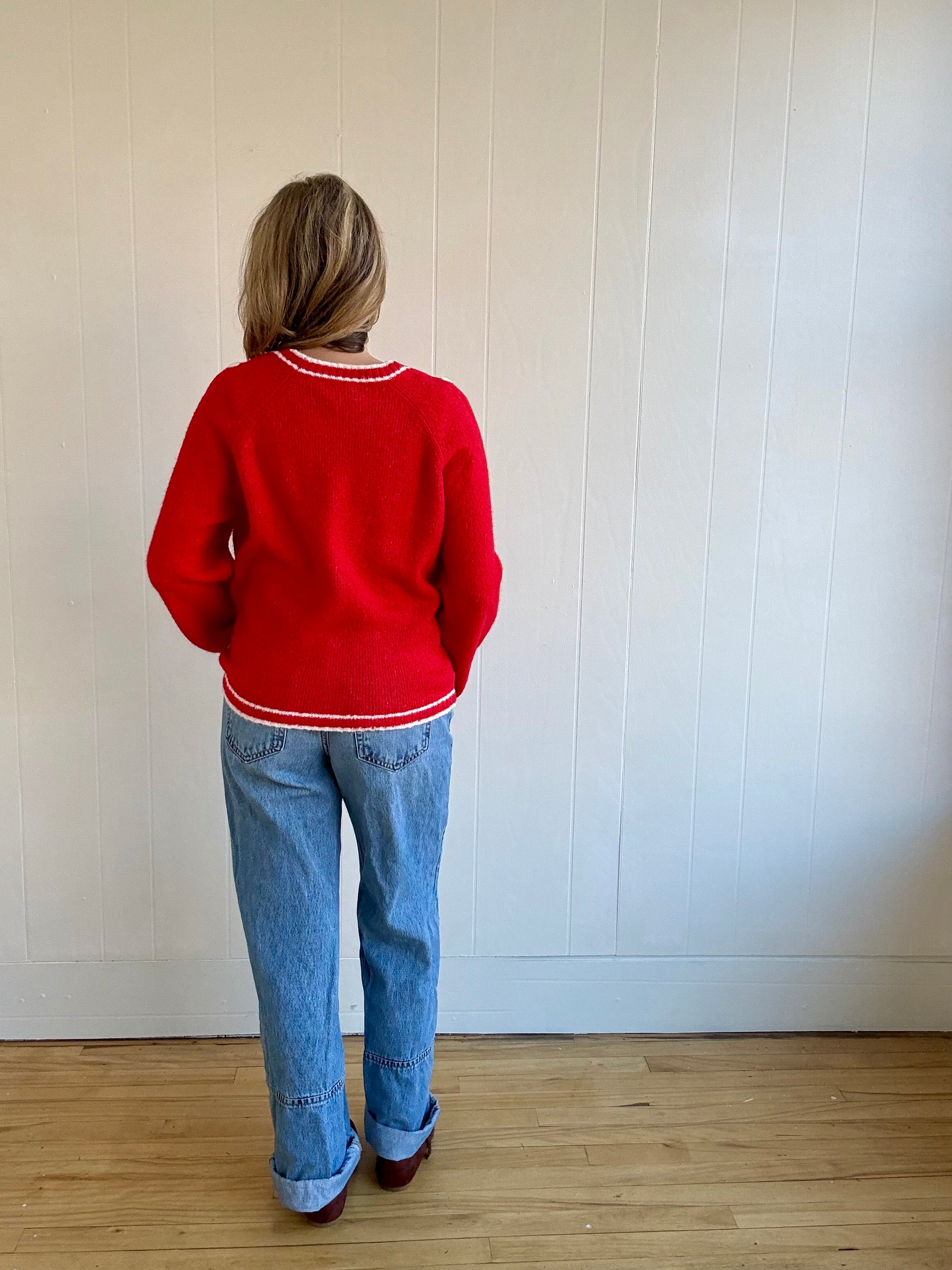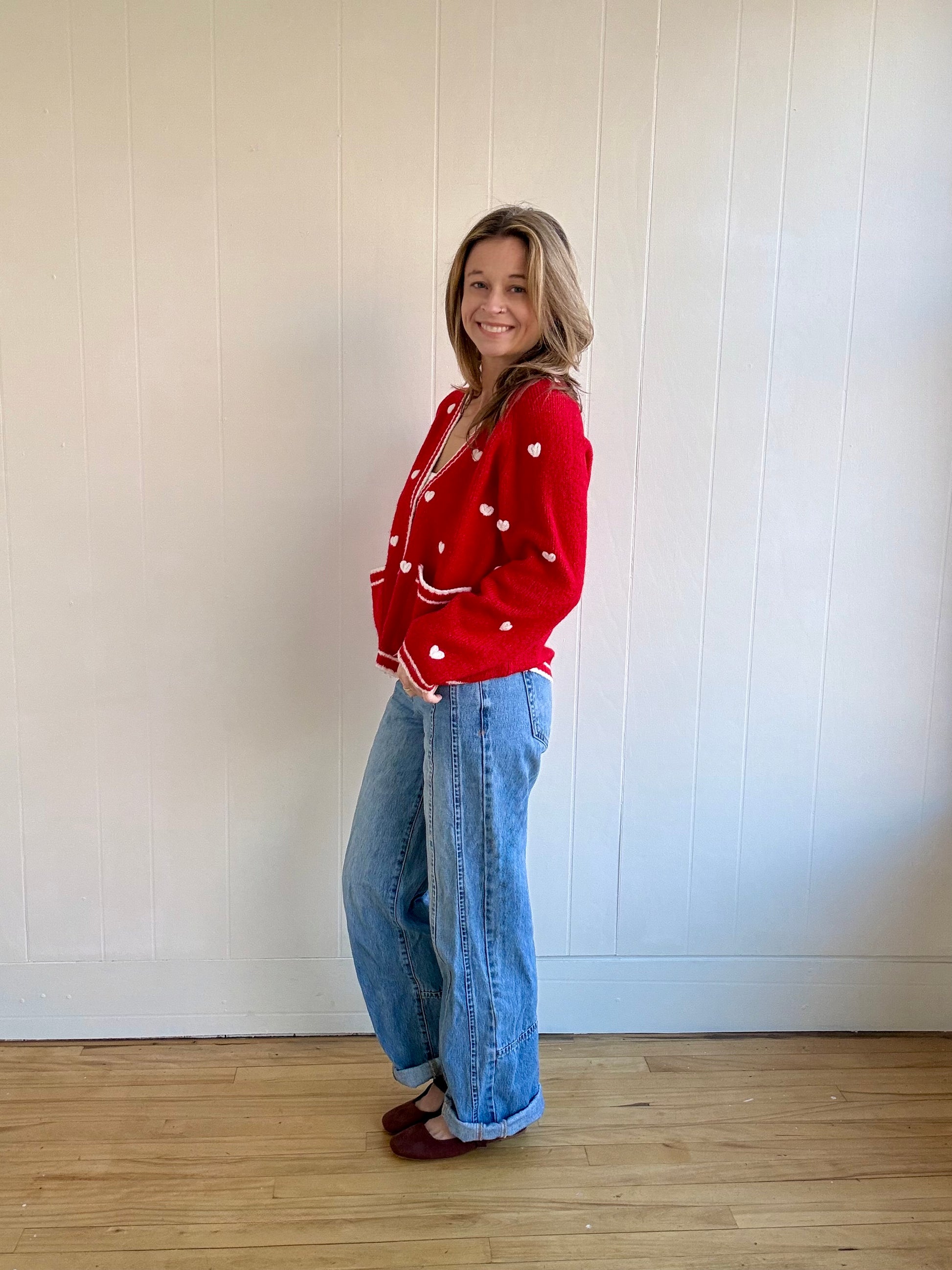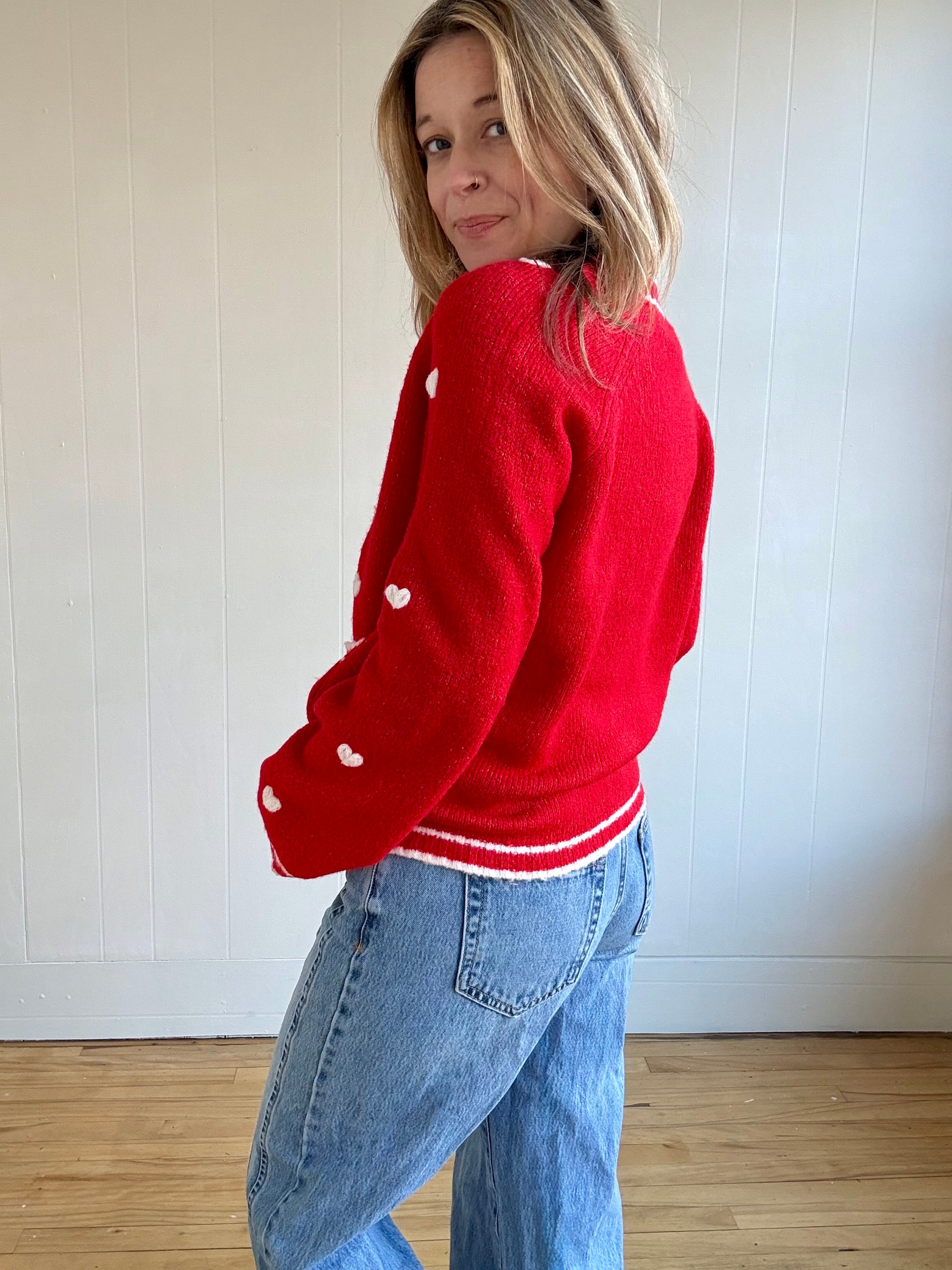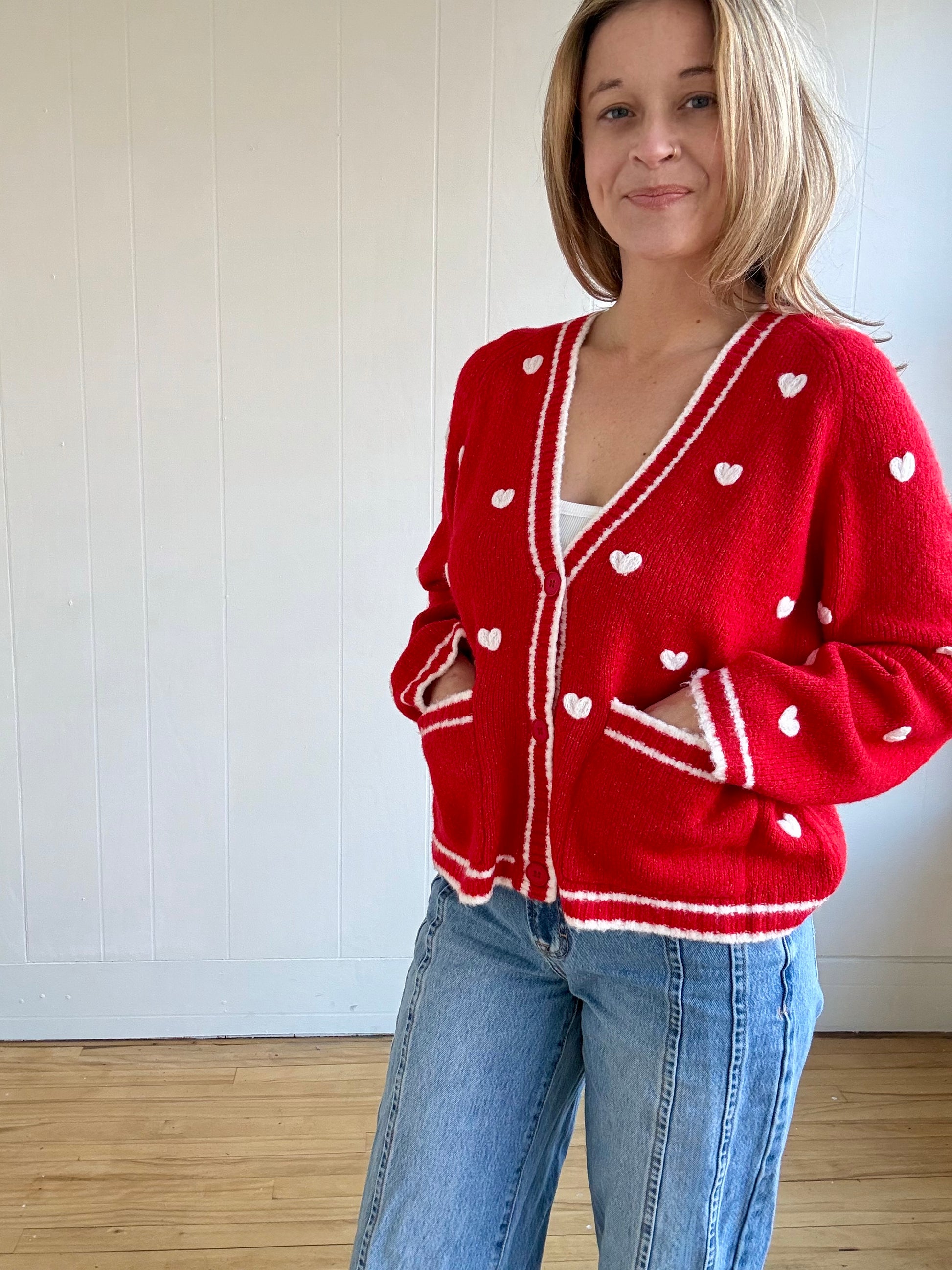 Add a dose of sweetness to your collection with this adorable heart-patterned cardigan. Featuring a classic V-neck and sporty contrast striped trim, this soft knit layer creates a charming, preppy look perfect for any casual day.