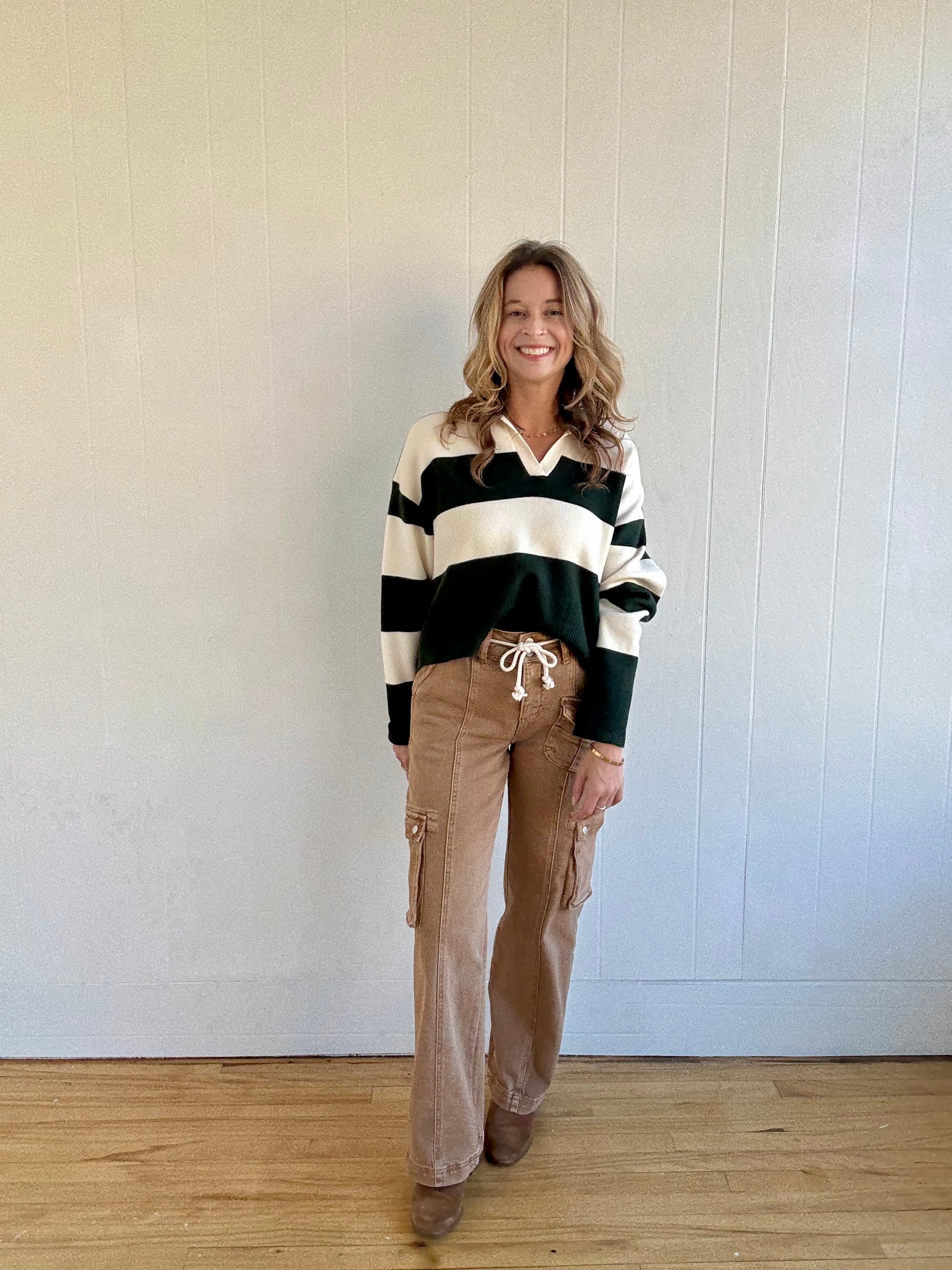 Elevate your casual days with this rugby-inspired knit sweater. Featuring bold horizontal stripes, a soft ribbed hem, and a classic collared neckline, it brings a fresh take on sporty-chic. Cozy yet breathable—perfect for layering over minis, denim, or leggings.