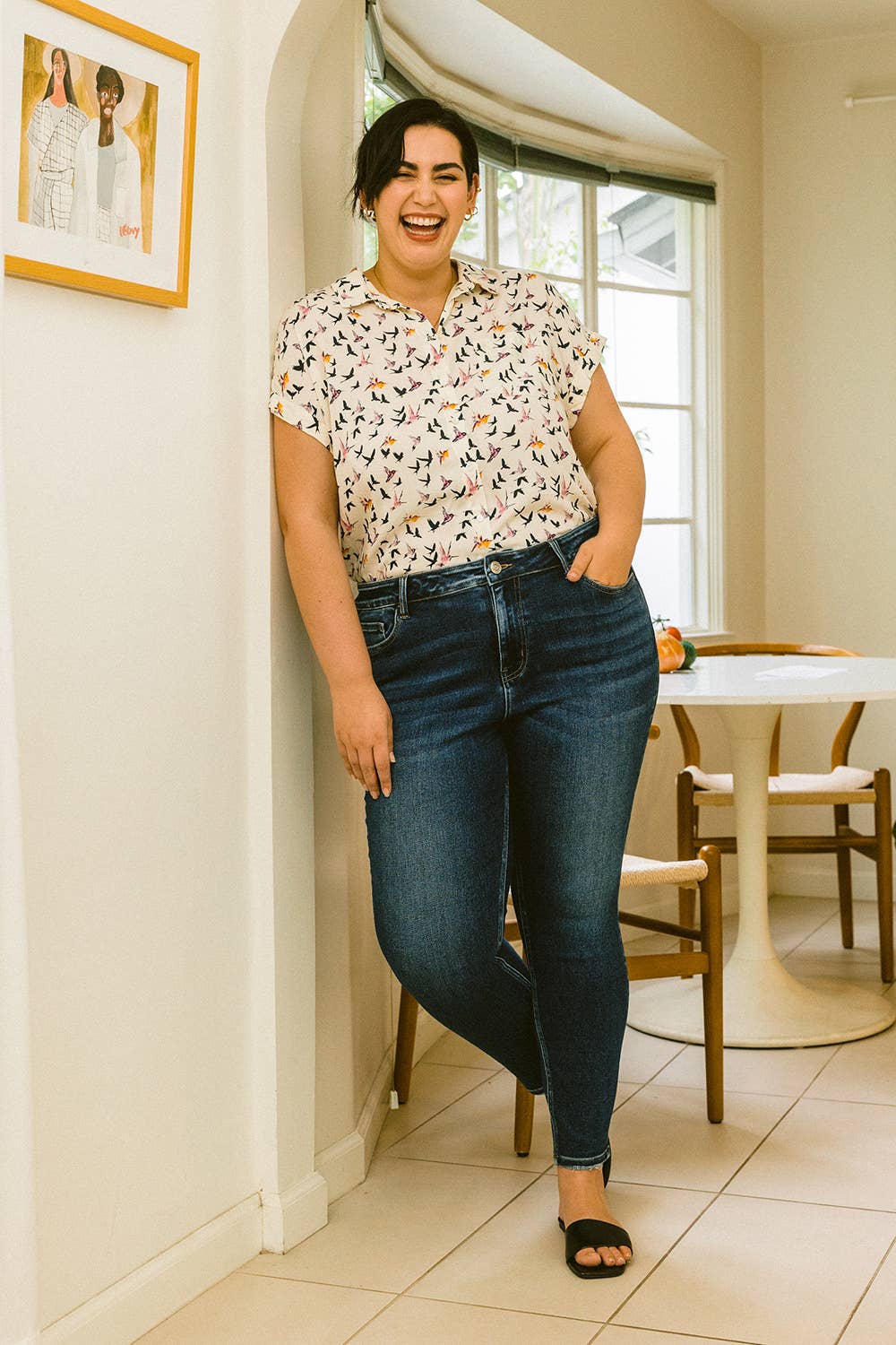 Superb high rise ankle skinny jeans in plus. Comfort stretch denim, high rise waist, ankle length and skinny.