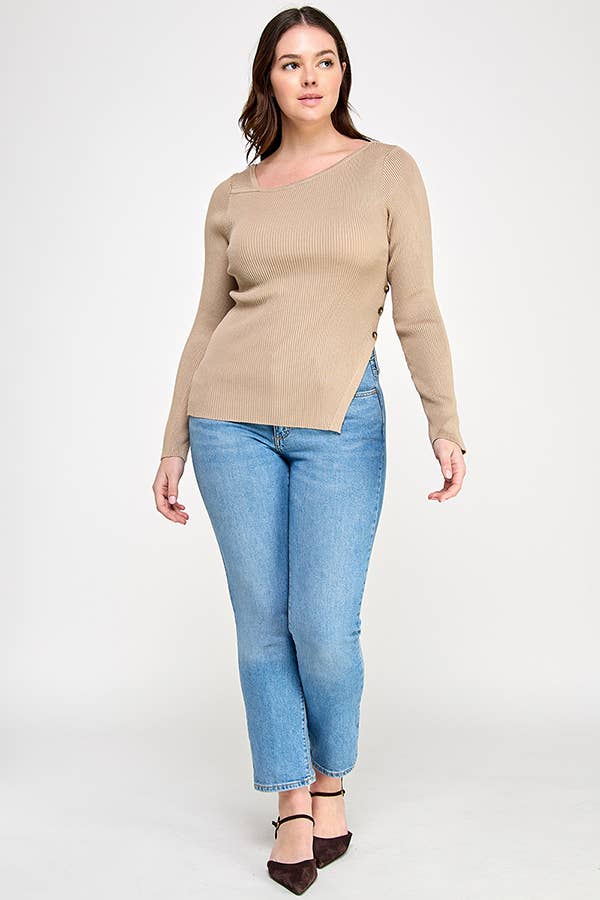 This plus size long sleeve knit sweater knit top features an asymmetrical neckline with a binding finish, fitted long sleeves, and side horn button detail with open side slit. Create a stylish and comfortable look with this versatile top.