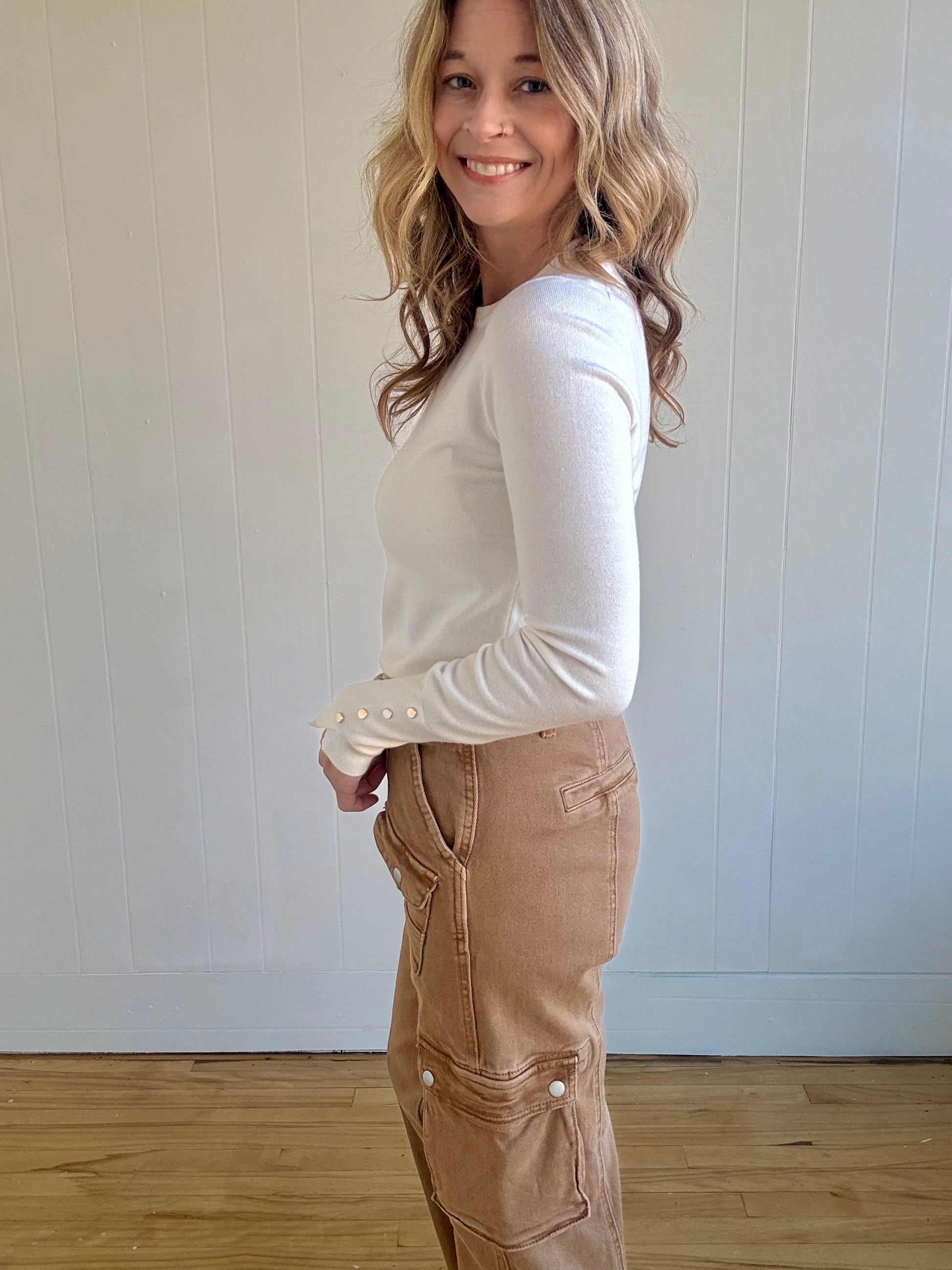 Elevate your basics with this sleek knit top, designed with a slim fit. The exceptionally soft, fine-gauge fabric offers refined comfort, while polished buttons at the cuff add a touch of sophisticated detail. It's the perfect piece for effortless layering or chic solo wear.