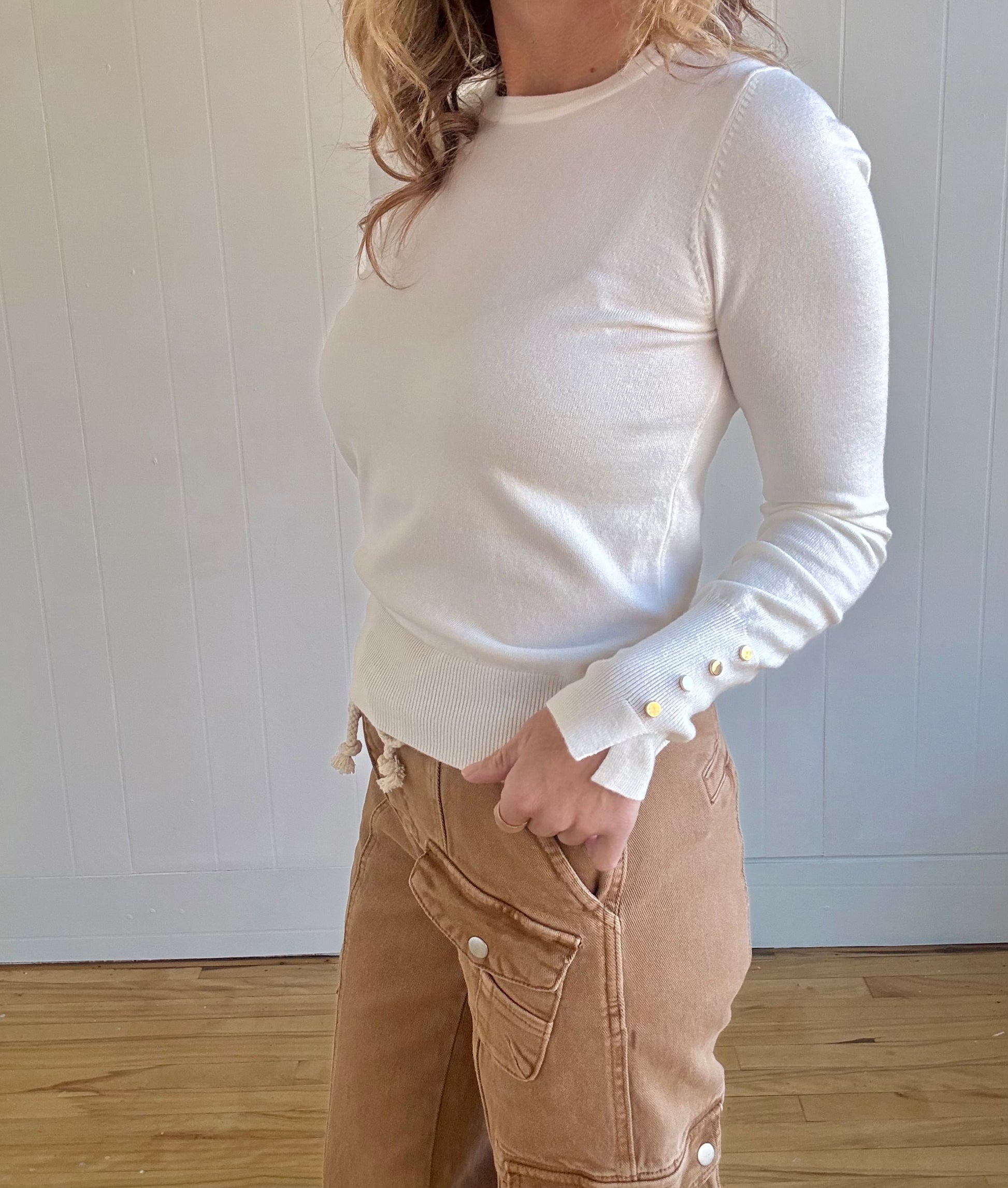 -Design: A classic, fine-gauge knit top with a round neckline and long sleeves accented with polished button details at the cuff.