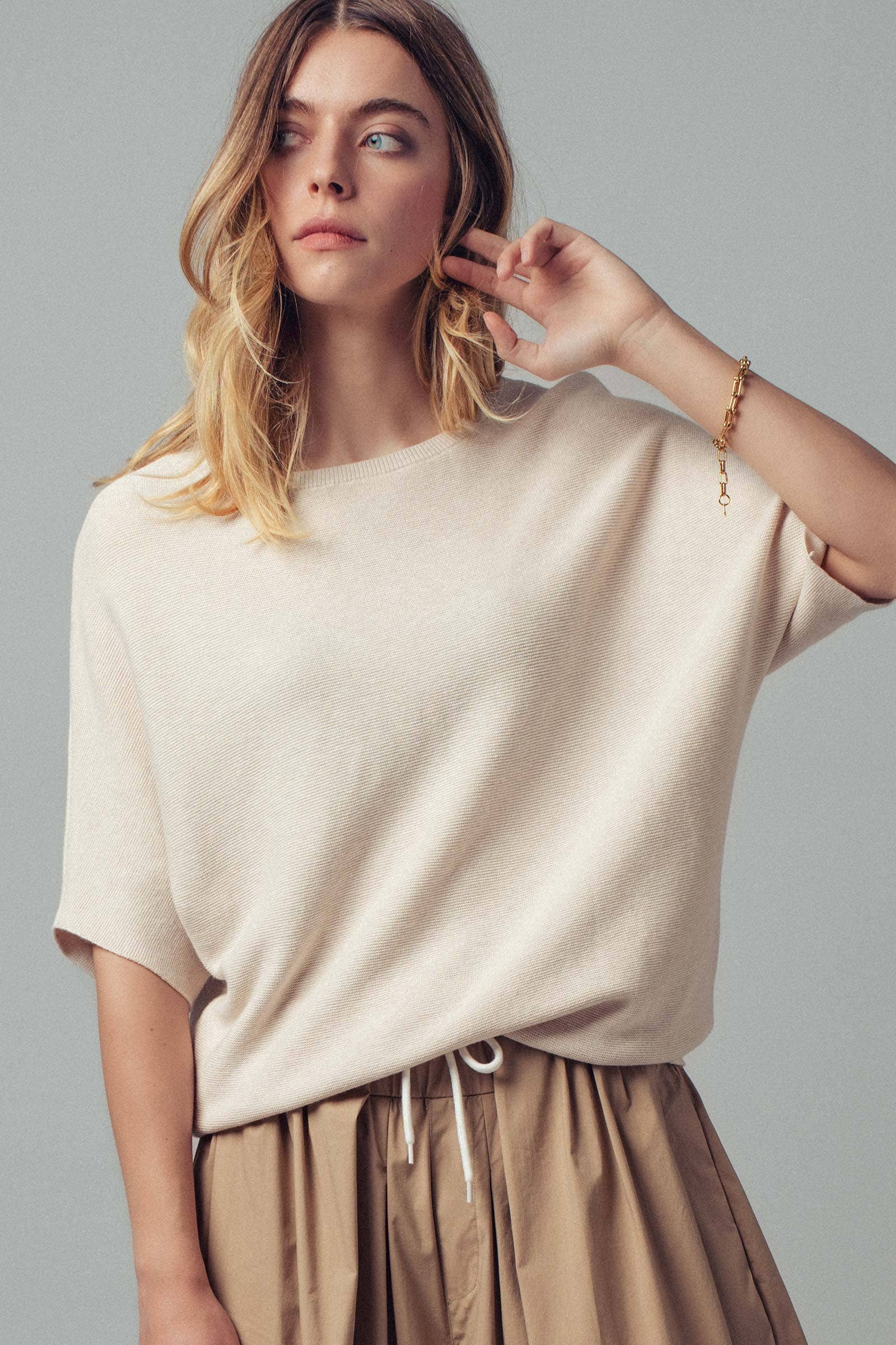A perfect blend of comfort and style, this relaxed knit top is a versatile wardrobe staple. It features an easy-wear boat neck, chic dolman sleeves, and a soft, textured knit. The banded hem gives it a polished silhouette that pairs effortlessly with skirts or trousers.