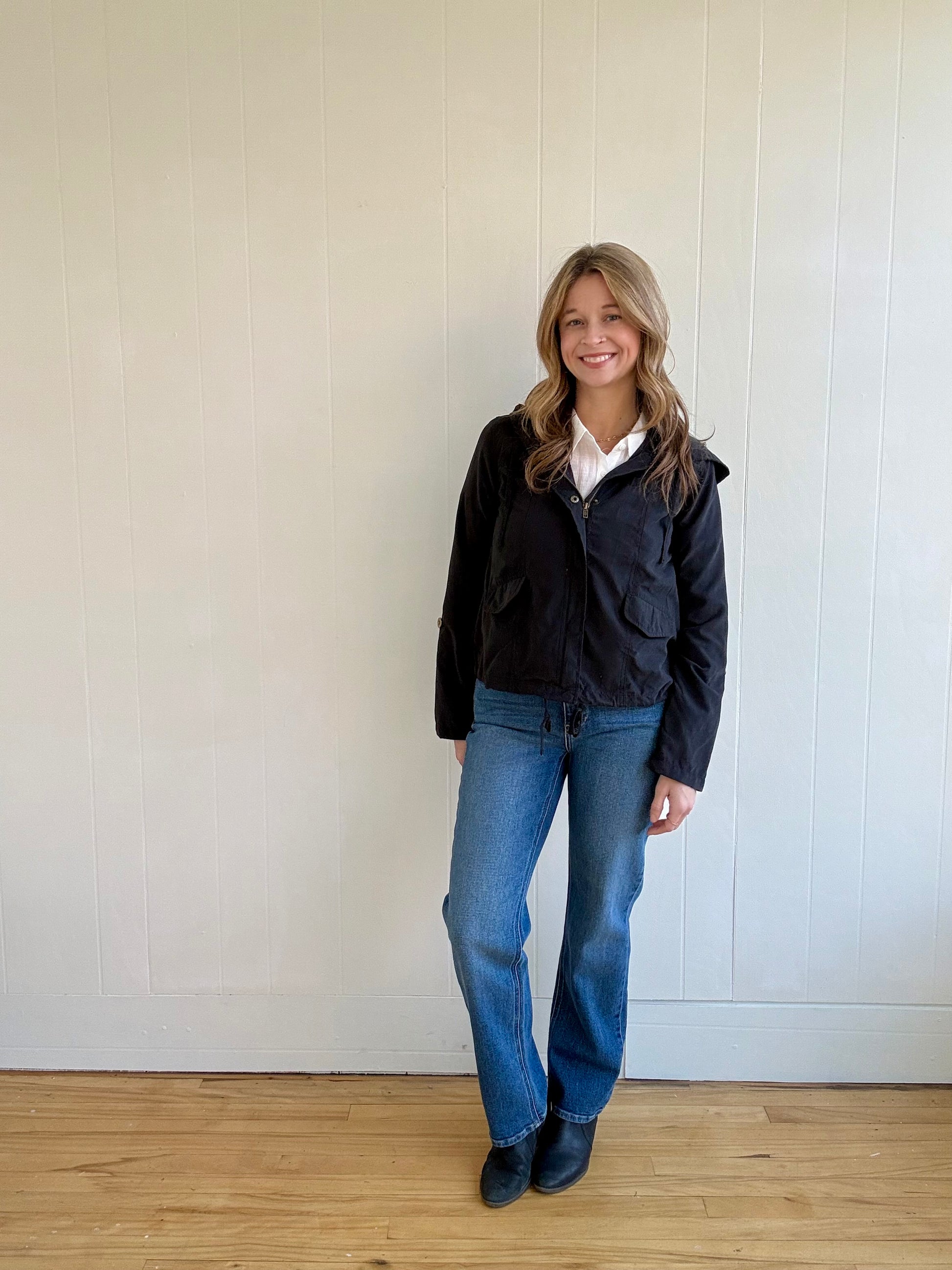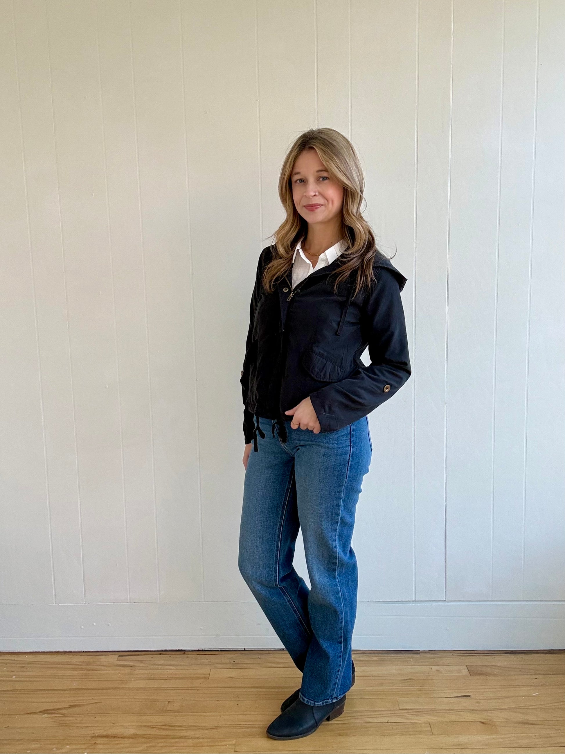 Stay warm and stylish in the Lee Jacket (Black). Featuring a front closure with snap buttons, long sleeves with the option to roll up and secure with a tab, and a 3/4 sleeve hem, this jacket offers both versatility and functionality. With a drawstring tie, front pockets, and drawstring hood, you'll have plenty of storage and protection from the elements.