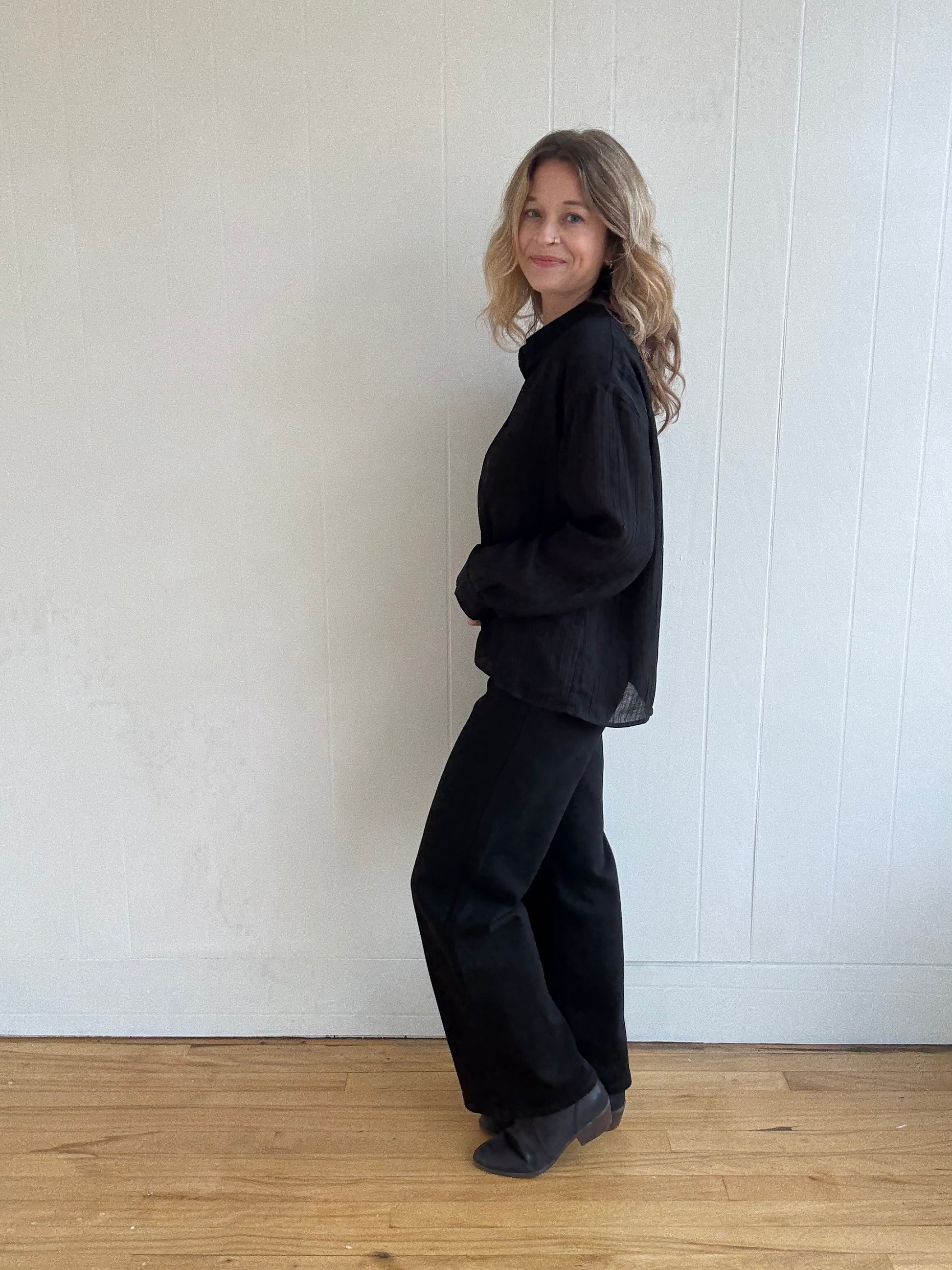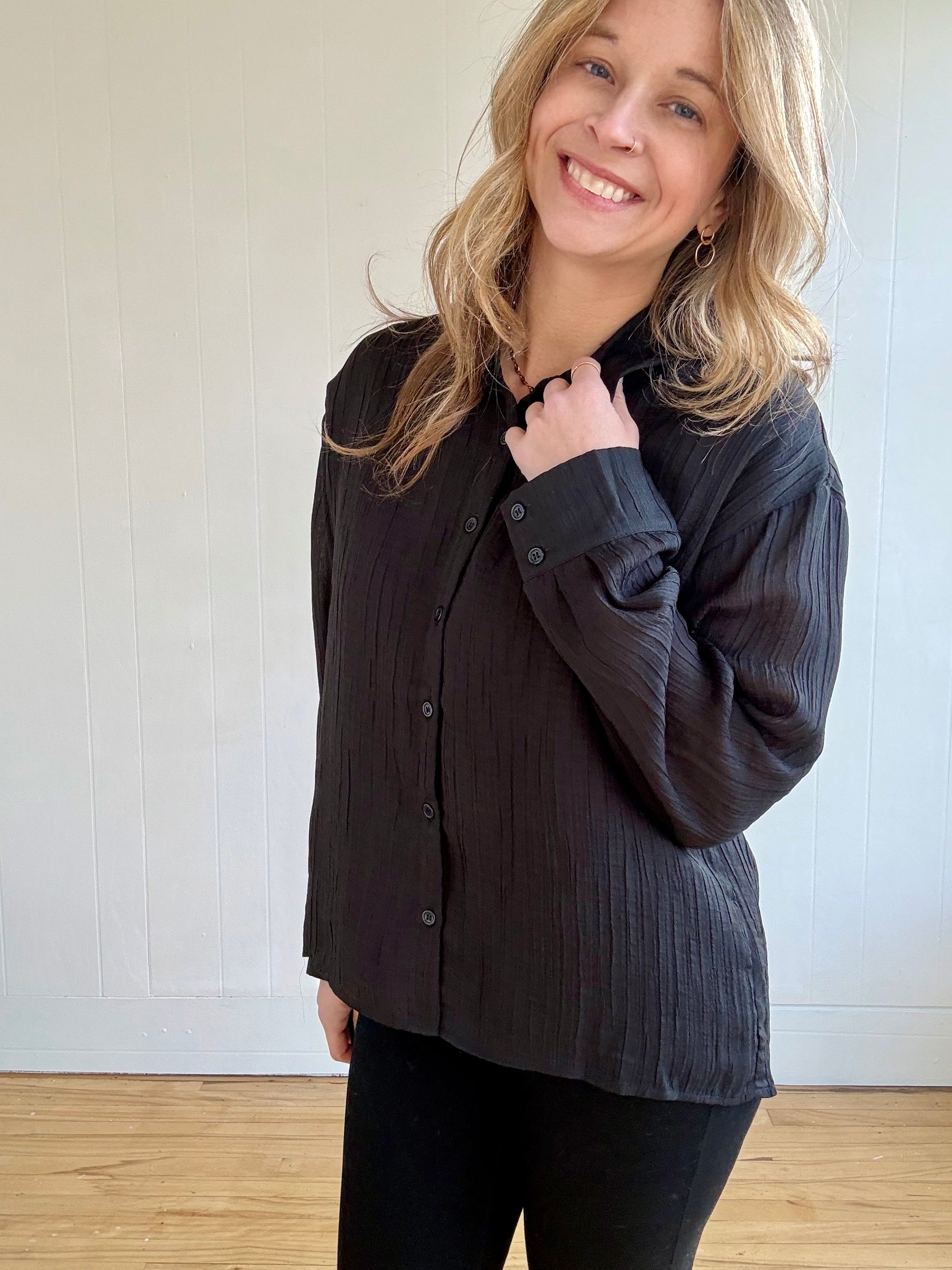 Indulge in the luxurious texture and style of our Anne Textured Shirt in classic black. Crafted with a long sleeve button-up design, this shirt is perfect for any occasion. Elevate your wardrobe with this premium piece, designed for those who appreciate the finer things in life. Available in size large. Self: 100% Polyester. Lining: 92% Polyester, 8% Spandex.