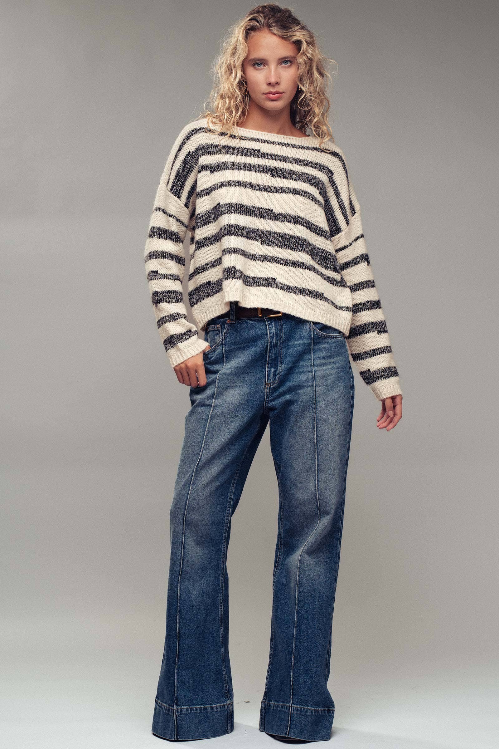 Bring effortless charm to your collection with our striped boatneck knit sweater, a versatile layer designed for cozy everyday wear. Crafted from a soft knit blend, it features a timeless black-and-cream stripe pattern that pairs effortlessly with denim, skirts, or tailored trousers. The relaxed boat neckline and dropped shoulders add a casual feel, while the cropped hemline makes it an easy match with high-rise bottoms. Its loose, boxy silhouette drapes comfortably, creating a modern yet laid-back look.