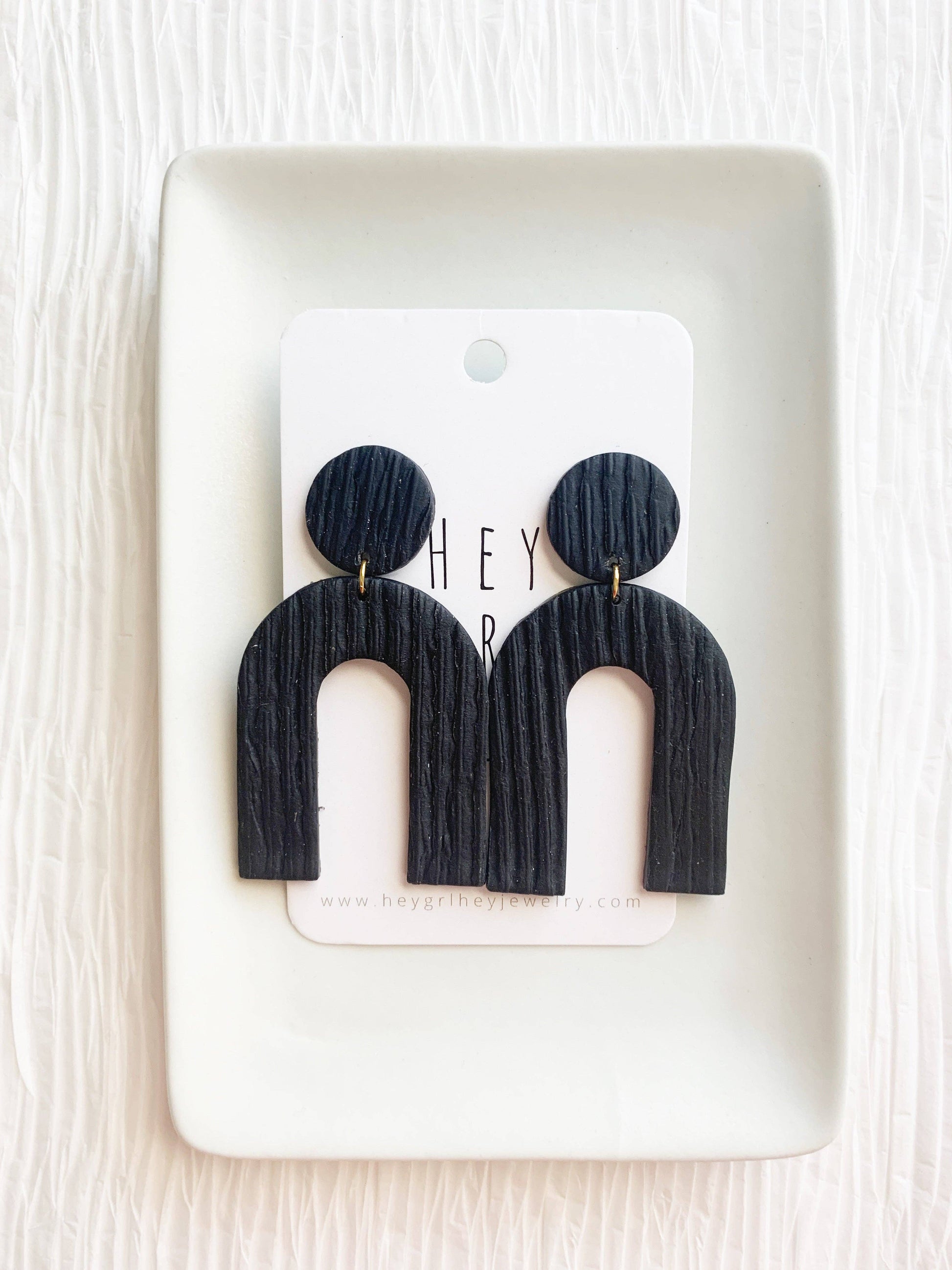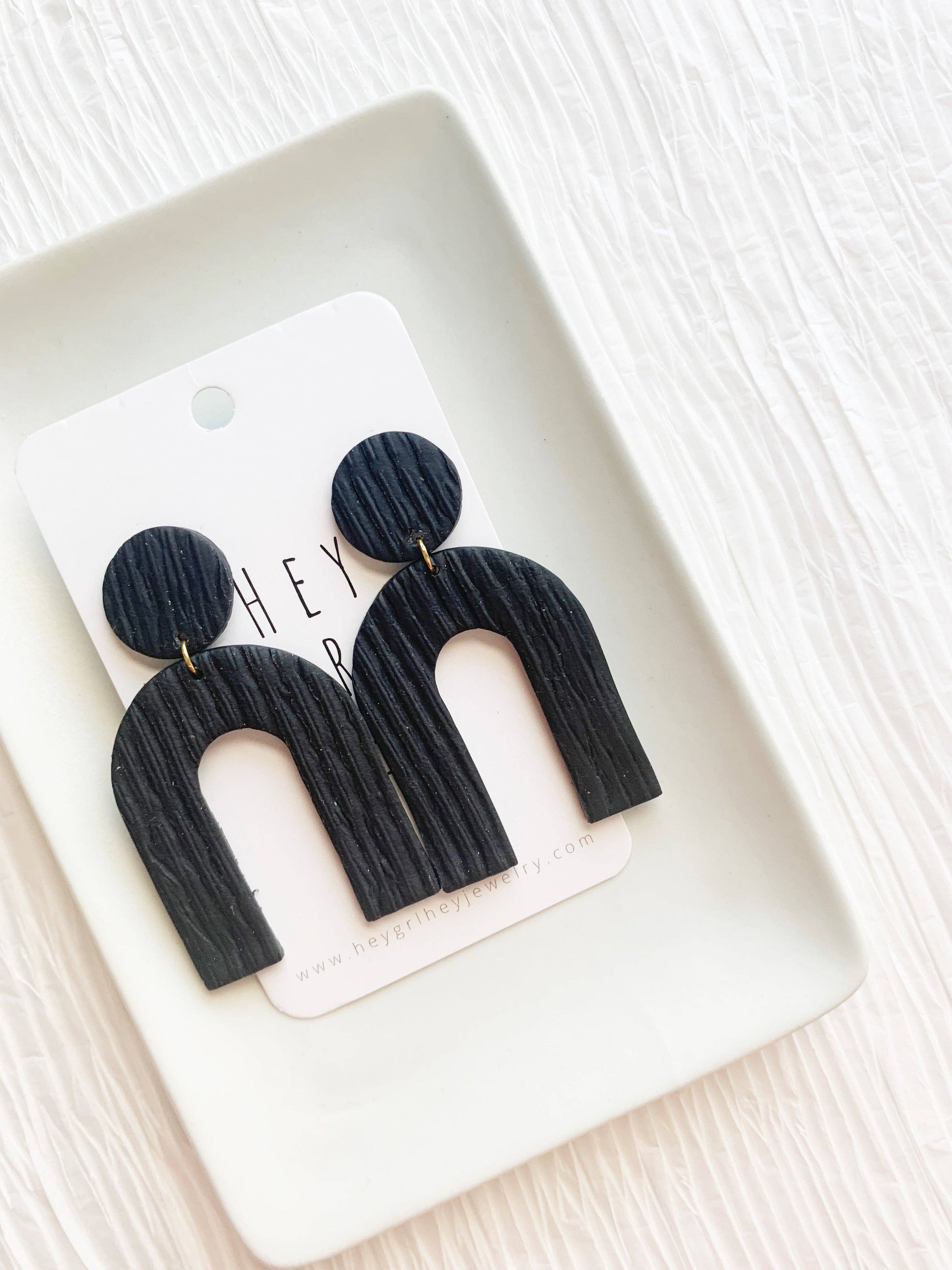 Crafted with clay and nickel-free ear posts, these Azeri Earrings in Black have an approximate size of 2.75 inches. Due to the handmade nature of this product, the color and texture may vary slightly from what is shown on your screen. Please keep in mind that this item is not made by a machine, but by a human, resulting in potential inconsistencies and flaws. Embrace these imperfections as they only add to the unique beauty of the product. As clay is delicate, handle with care to avoid breakage. When not in use, we recommend storing your Hey Grl Hey Jewelry in a safe place. Over time, raw brass may darken or tarnish when exposed to water or oils from the skin. To clean, simply use a soft jewelry cloth or tarnish remover.