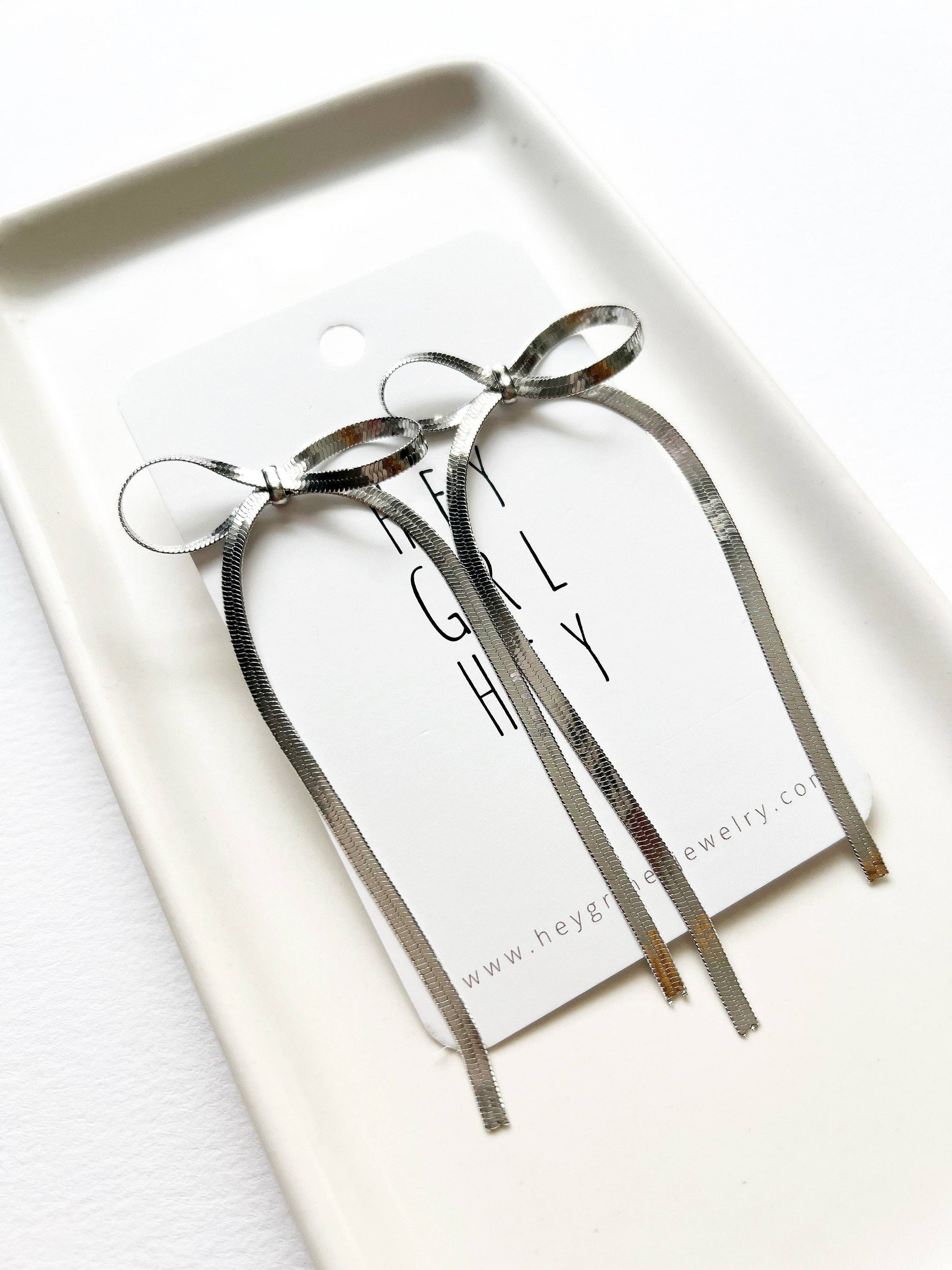 Experience minimalism at its finest with these 2.75 inch long Bexley Bow Earrings in Silver. Made from gold plated brass with nickel free ear posts, each pair is unique due to the handmade nature of the product. Please note that color and texture may vary slightly from what is displayed on your screen. As an expert in the industry, we recommend handling these delicate earrings with care and storing them in a safe place when not being worn. These elegant and understated hoops are a statement piece for any minimalist jewelry collection.