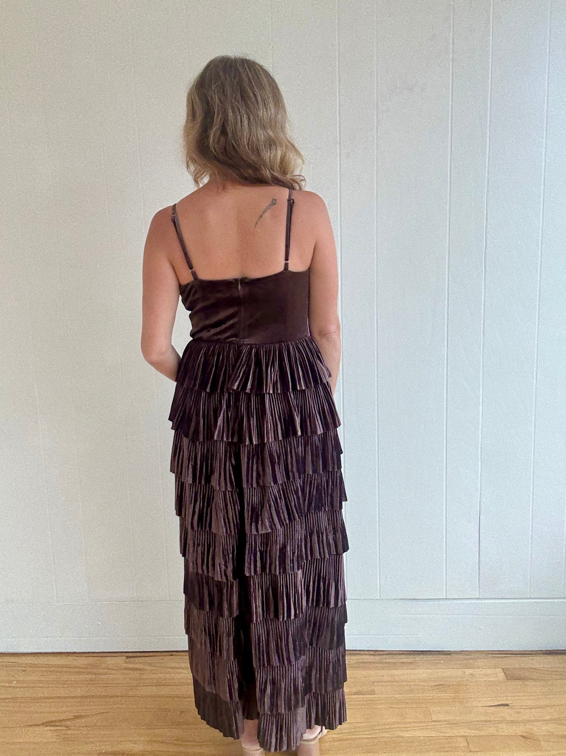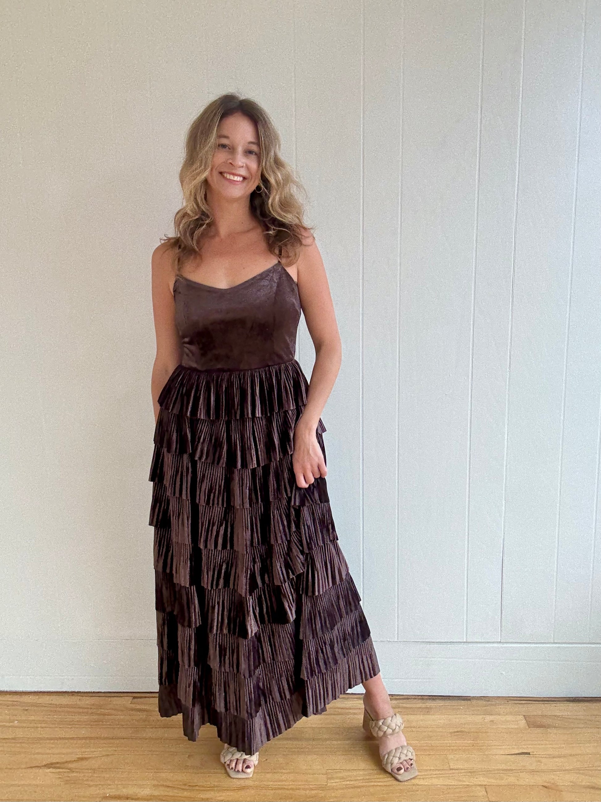 This elegant velvet pleated tier dress features an adjustable shoulder strap and full lining. The side invisible zipper allows for a flawless and comfortable fit. A perfect choice for any holiday season or special occasion.